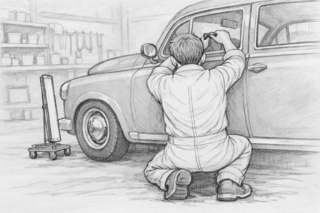 適切な環境を整え、反射や映り込みを確認しながら慎重に作業を行います